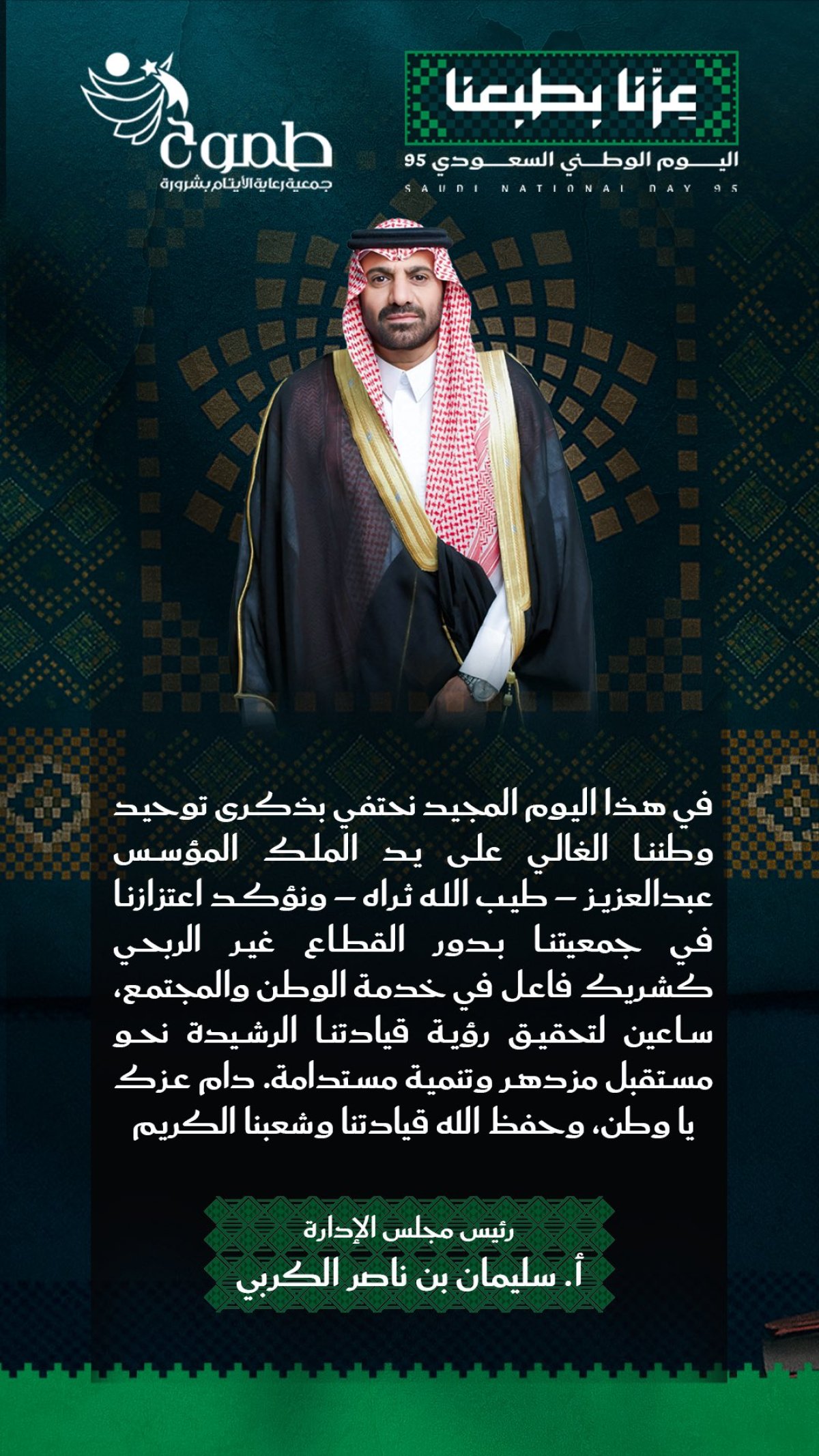 رئيس المجلس بمناسبة اليوم الوطني السعودي 95 نؤكد اعتزازنا في جمعيتنا بدور القطاع غير الربحي كشريك فاعل في خدمة الوطن والمجتمع